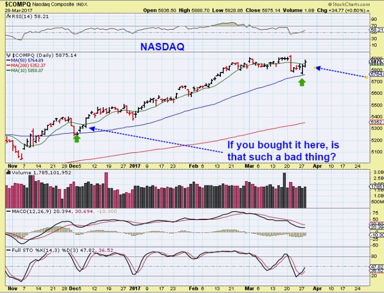 NASDAQ – Food for thought. Some felt that they ‘missed buying the lows’ this week and want to ‘wait for a pullback’. IF Monday was The Low, then Tuesday was day 1, so a pullback days from now wont be lower than day 1, correct? Maybe you didn’t catch THE BOTTOM TICK. You didn’t buy on the 50sma tag. That is fine, because we always encourage buying after a little confirmation anyway, after a swing low follow through for safety sake. SO, if you are thinking that the markets are going to just continue higher, and Tuesday was DAY 1 of the next move higher, then today is day 2 if that was a swing low. See this chart of the NASDAQ. Waiting for a pullback may not make sense, just use a stop in case the selling picks up again.