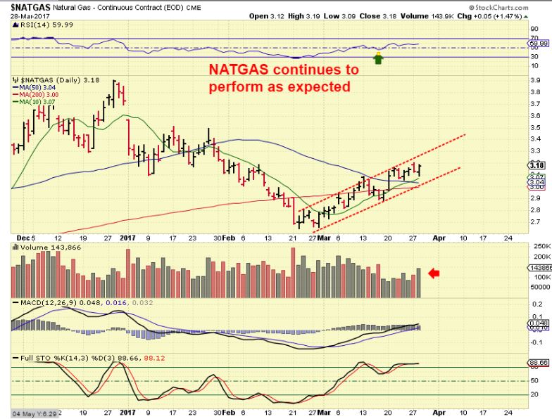 NATGAS continues to perform as expected, but progress has been slower than I had hoped so far. I’m impatient, but the reason is that I have seen NATGAS take off and run like a gazelle, yet we are in a bit of a slow methodical climb here. See the chart.