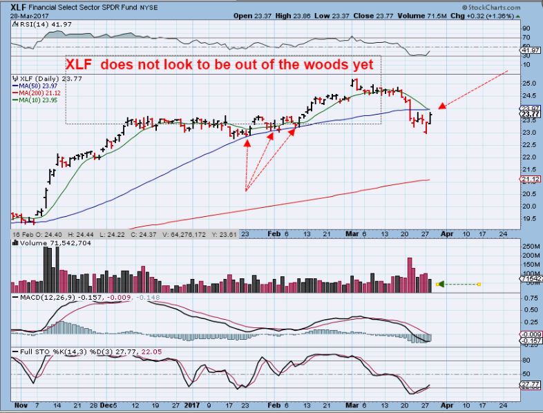 XLF – The XLF lost the 50sma on big volume and now we see sort of a back test. It might be about to recover, but basically this is not out of the woods until it recovers in my book. That doesn’t mean that one cant go long the general markets, you just need to be aware of things like this and use & honor stops.