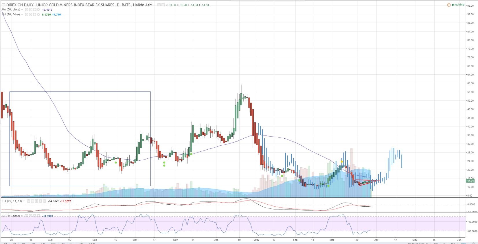 Seems like a long leash on 3x JDST if the stop is 50 SMA on GDXJ? But I guess it depends on your convictions 🙂