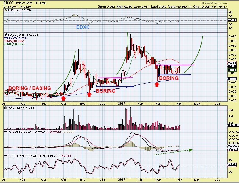 EDXC – Slow boring consolidations eventually broke out higher. EDXC is in a consolidation.