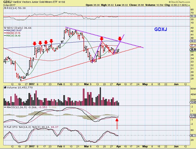 # 8 GDXJ at the close – It did NOT break from the triangle shown in the chart above, but if it does, the bigger pic resistance is where the purple downtrend line and the 200sma intersects. That is $39.07 and for those holding JDST, if that happens, that will hurt. Protection is key for active traders if this breaks out higher.