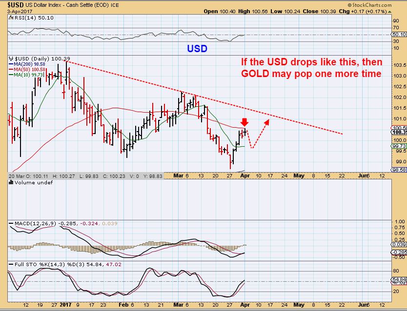 # 1 USD – If the USD pulls back at the 50sma, that would cause GOLD to run back up to the 200sma, and Miners could also react higher. This is still a short term move with ‘time’ limits. ( EDIT: The USD broke above the 50sma in pre-market). Gold continued toward the 200sma.