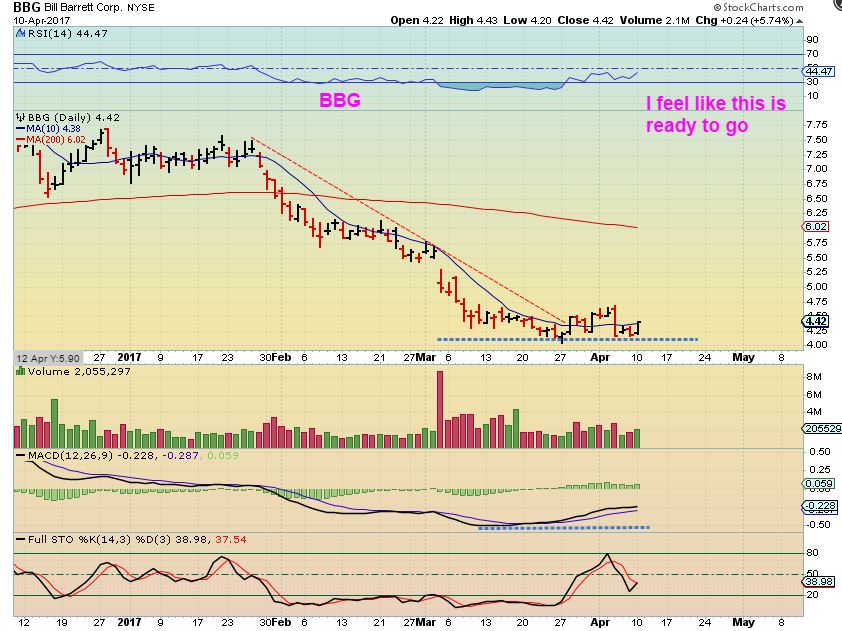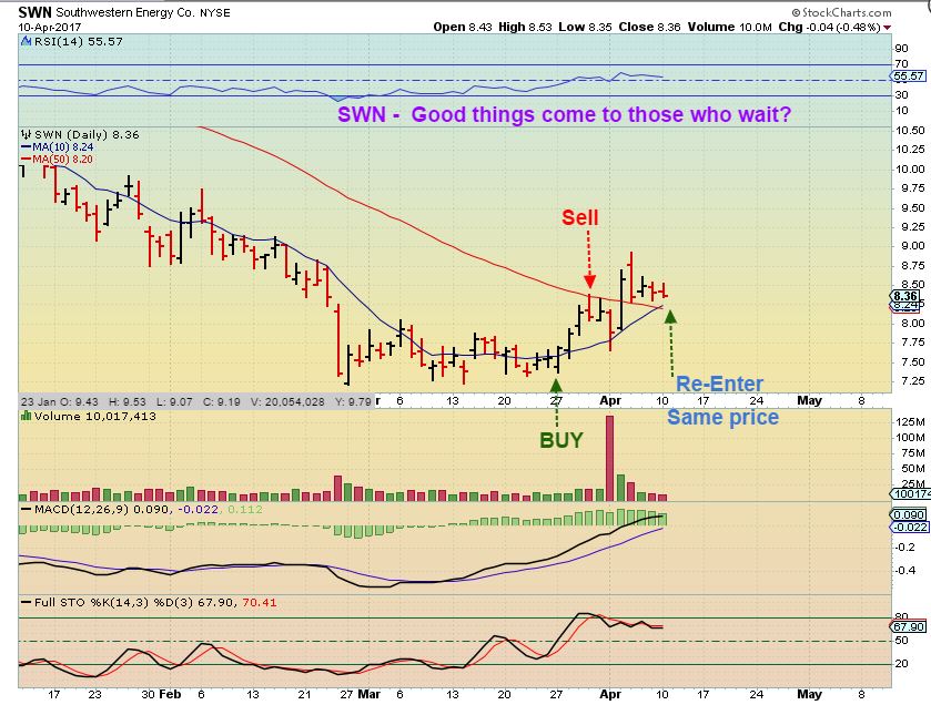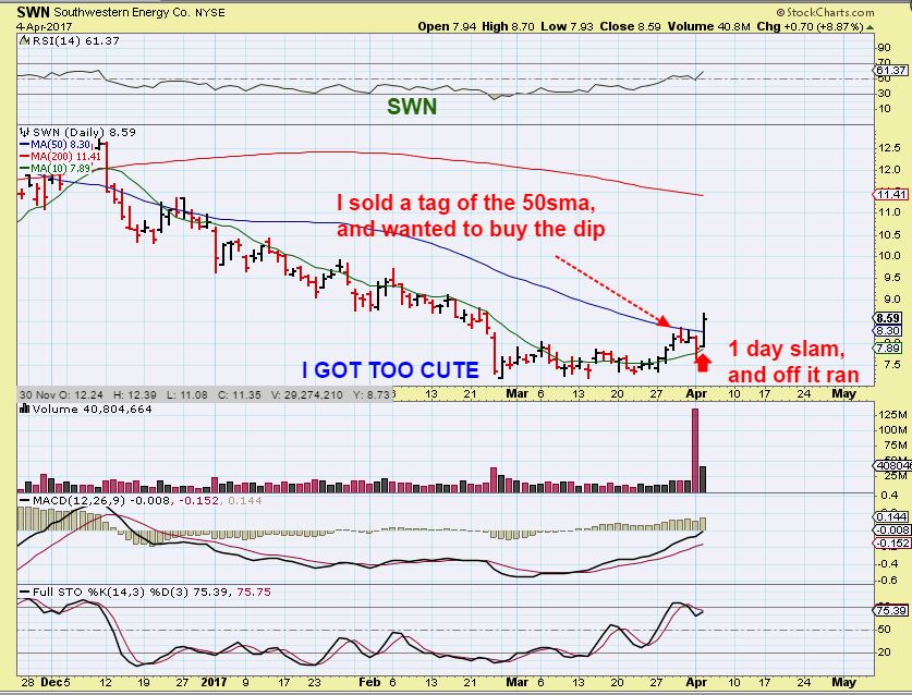 April 4th – I had just sold my SWN for a profit at the 50sma and wanted to re-enter on a dip & suddenly it just POPPED right through the 50sma. Did I miss re-entry completely? I thought that I did…