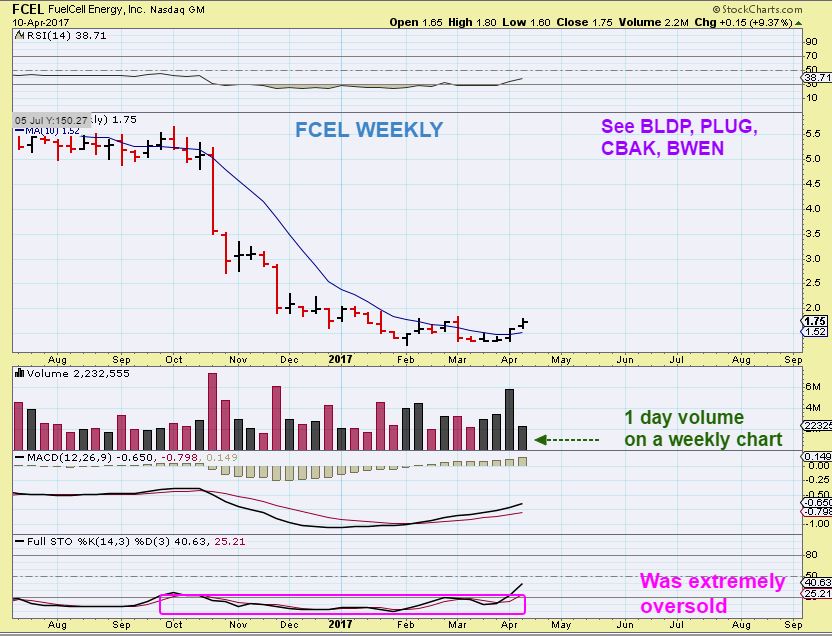 FCEL WEEKLY – I bought this double bottom low when I saw PLUG, BLDP, etc taking off. It has gone higher every day since I bought it, but it could even continue to move higher with this weekly set up.