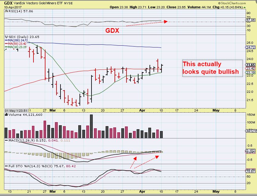 so far so good, but GDX did break its 50 heading to the 200sma, so I have to wonder if Gold was up tomorrow would GDXJ try that? I think that some outside influences could be adding bullish pressure ( The Syria, N. Korea situation, etc).