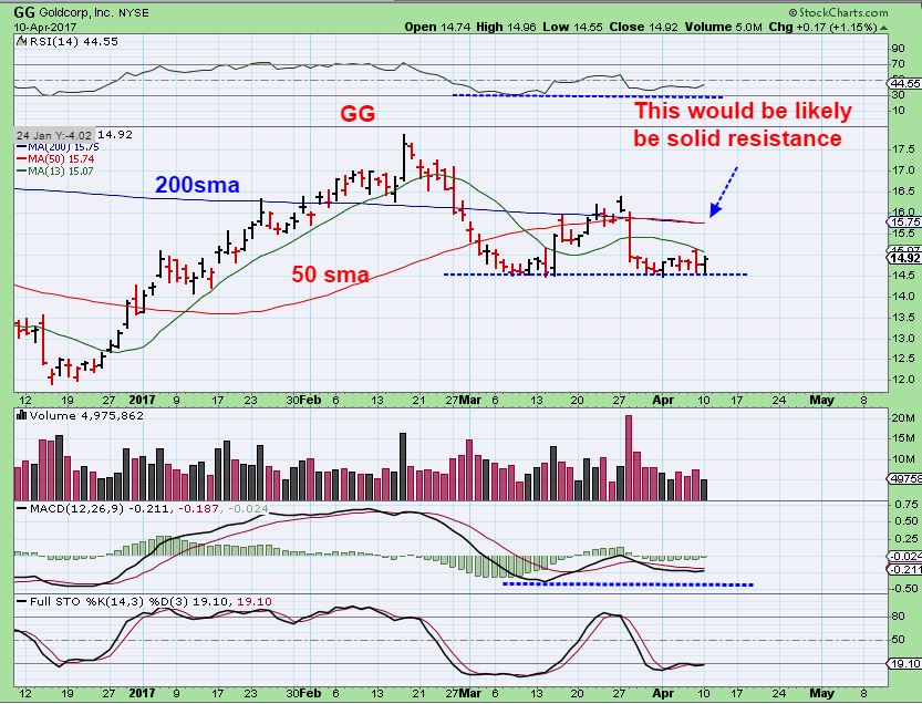 MIXED SIGNAL – Some Miners look bullish and others just do not. GG has bullish divergence with this double bottom consolidation, but the 50 & 200sma are tightly pinched together and will probably stop any upside pop again.