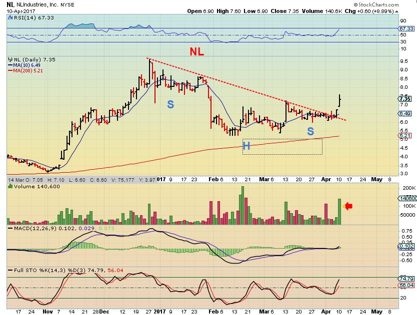 NL – A large volume POP with a gap. The BUY was the break of the trend line, so if I had entered there Friday when I was watching it, I’d be happy with this follow through. At this point and with that Gap open, I’d have to wait for a pullback to comfortably enter now.