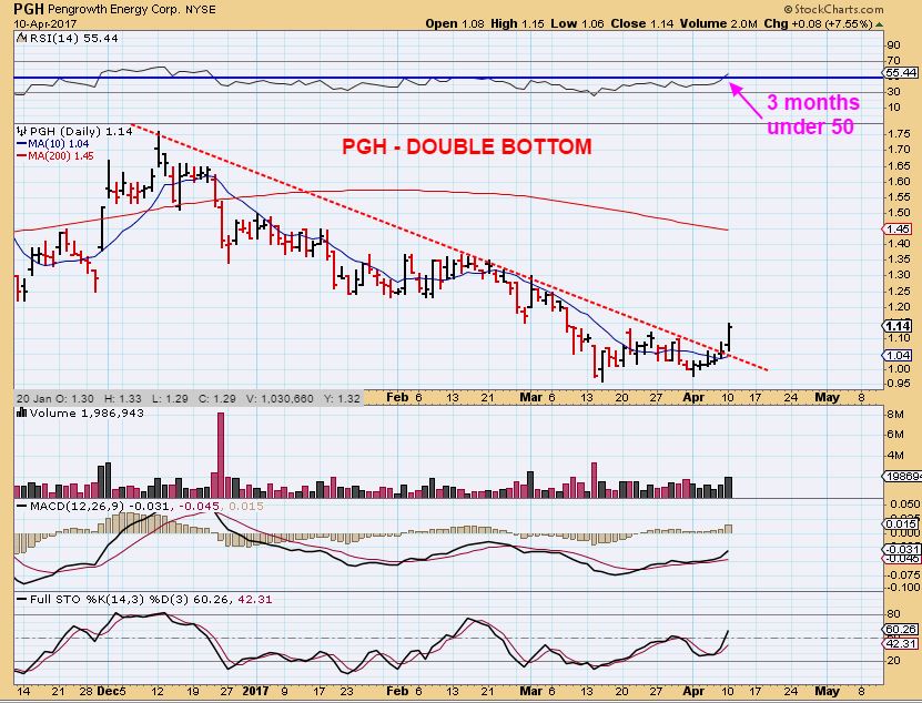 PGH – This double bottom looks solid with bullish divergence. I think that this could run right to the 200sma, and thats a good %-Gainer.