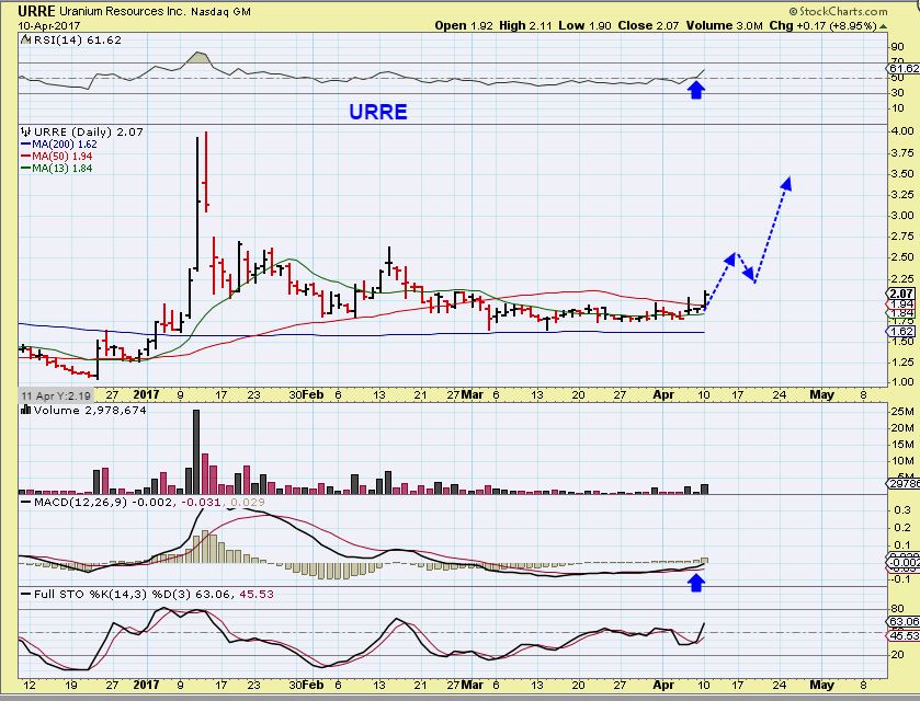 URRE – Long base after that last burst higher, and it looks to possibly be ready to run again. IT is not too late to buy these. If this runs to $4 over time ( Jan highs), aren’t 100% gains good enough 🙂