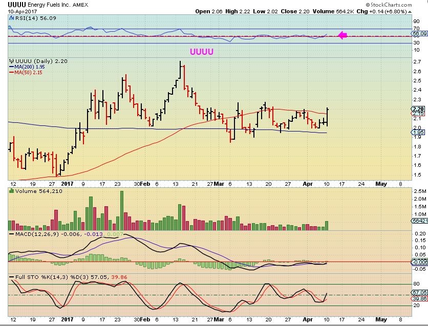 UUUU– Breaking above the 50sma with increasing volume. This has turned into a 3 month consolidation of the last run higher. Please check out a 1 year chart on all of these if you are interested.