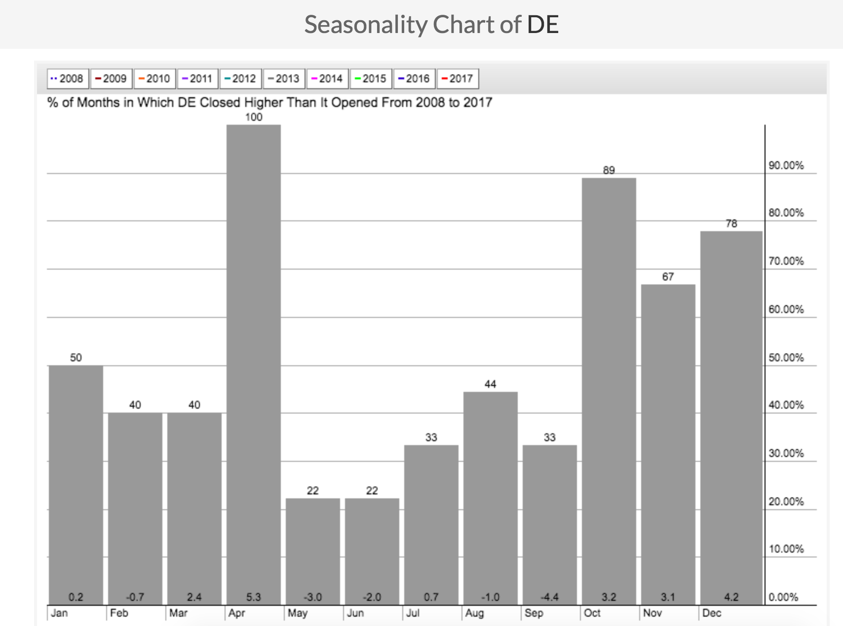 quick update on DE. I closed my short yesterday. Very strong. Simple reason: the seasonality. Check this out. April has been 100% positive for DE in the last 8 years… but May is going to fun 🙂 https://uploads.disquscdn.com/images/a9a31d2aafc95c49884de384836ea97045a010b4379570c653720bfcd7f40cf0.png