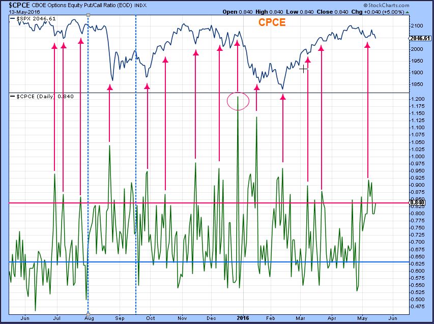 REVIEW OF A SHORT TERM INDICATOR : In past reports I have used the Put Call ratio as one way of seeing how negative sentiment is.  I then pointed out (  On this Feb 2016 chart for example) how often a trade-able lows of some sort or a good bounce occurs in the SPX  when the CPCE broke or spiked above that 90 – 1.00 mark.  Please look at the chart below- Notice that those spikes often lead to lows and a bounce ( often near or at DCLs or ICLs).  SPX is the top box, PUT / CALL is found in the middle box.  Those spikes ( Blue lines) were pointed out as occurring at SPX lows.