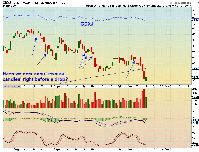 GDXJ had reversal candles then too, but it still rolled over when the “timing” was right.  See the chart and also…