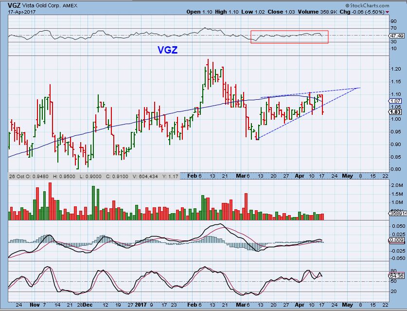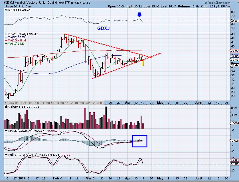 GDXJ  3:15 yesterday –  is obviously way below the performance of Gold and the larger cap Miners.  GDXJ started to break down as expected, at the 50sma.  Some Juniors look healthy, others are breaking down now. Yes I’ve read the stories about GDXJ.