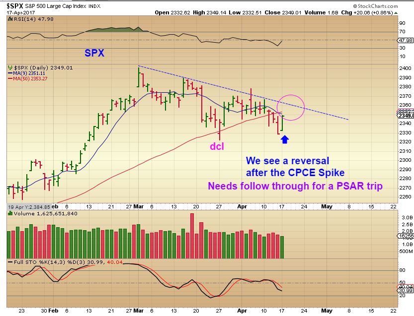 SO basically I am just trying to show that sentiment hit an extremely bearish point when the SPX broke below the 50sma, and many bought PUTS.   The above chart spikes down and we get a PSAR TRIP usually at ICLS.   At times when I see spikes like that, it is usually NOT a good time to short the markets.  It is best to see if a new low is in place ( meaning that the last DCL will hold) and look for follow through upside. We could get a decent bounce or rally, and I’m still watching the XLF for signs too . It has broken down.
