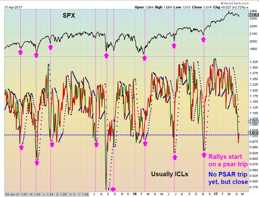 SO using this indicator ,  I used to wait for a PSAR signal after a spike down below 1.00.   Notice that the dip on this chart below 1.00 is RARE.  INTERESTING –  It usually comes around ICLs.   We dipped there already with the small SPX drop.  THAT is interesting and I need to study this further.  The top box shows that the SPX  often bottoms  & we get a good bounce at a spike down below 1.00 and then a PSAR signal.   So here, We do NOT have a PSAR signal change yet, but  I do think the SPX would have one if it did recover the 50sma and break out.  It almost looks like it marked an ICL at the last dcl. Notice that the last one was in NOV at the ICL, and then JULY before that.