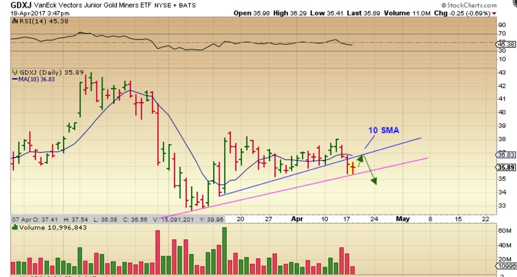 GDXJ  3:15 yesterday –  is obviously way below the performance of Gold and the larger cap Miners.  GDXJ started to break down as expected, at the 50sma.  Some Juniors look healthy, others are breaking down now. Yes I’ve read the stories about GDXJ.
