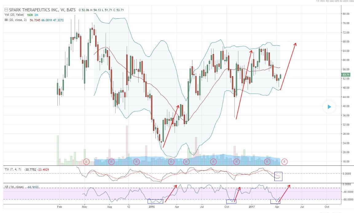 Its a little different Pharma. Its gene therapy. They have patents on the delivery method. They basically provide one time treatment to cure problems. They have a cure currently for some kinds of blindness. They have others set to release later this year. The problem is, how to charge for a 1 time treatment. Weekly %R is oversold, TSI crossing higher, Daily chart looks good as well. continuing higher lows indicate an uptrend. Lower BB looks to be support, set stop just below.