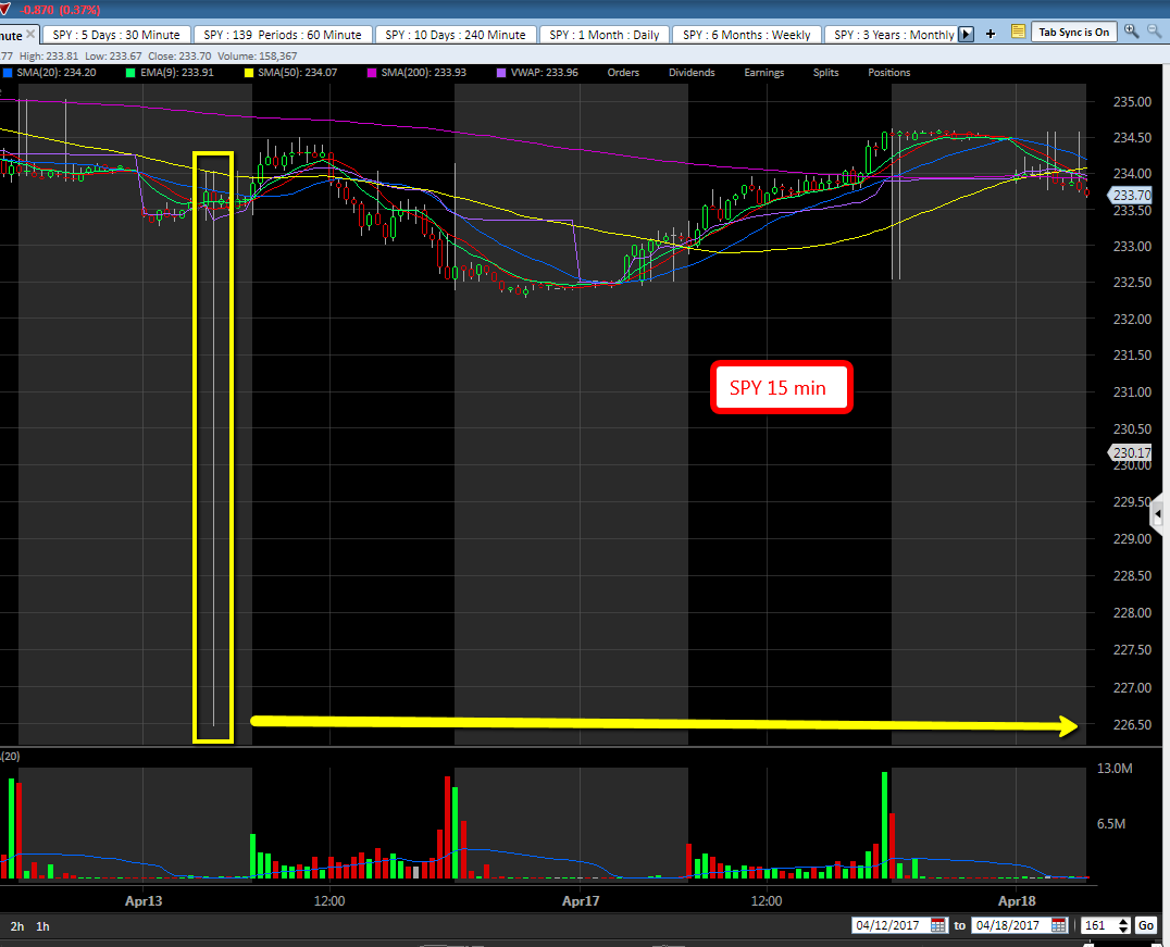 Alex, thanks for the detailed analysis of SPX. I bot TQQQ yesterday based on the test of its 50 day SMA last Thursday and recovery yesterday. I’m front-running my charts a bit because I do NOT yet have a “buy” on my daily chart but I did have a “buy” on my hourly and 2-hour charts, and that combined with VIX apparently topping yesterday I figured it was worth a shot since I wanted to have my entry point as close to the 50 day SMA as possible. So I’m watching closely and I’m well aware that the stocks could quickly roll over and fall harder. Check out this MASSIVE bearish “signal candle” on the 15 min chart of SPY. It points to a possible slam down to around $226! All of the stock indices are still a “sell” right now on my charts, so I want to see a good reversal today/tomorrow.