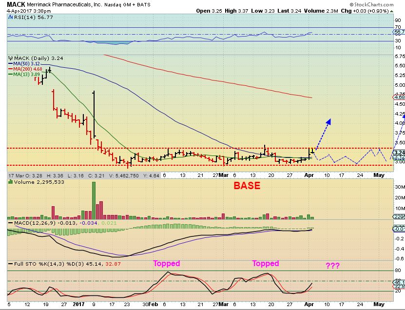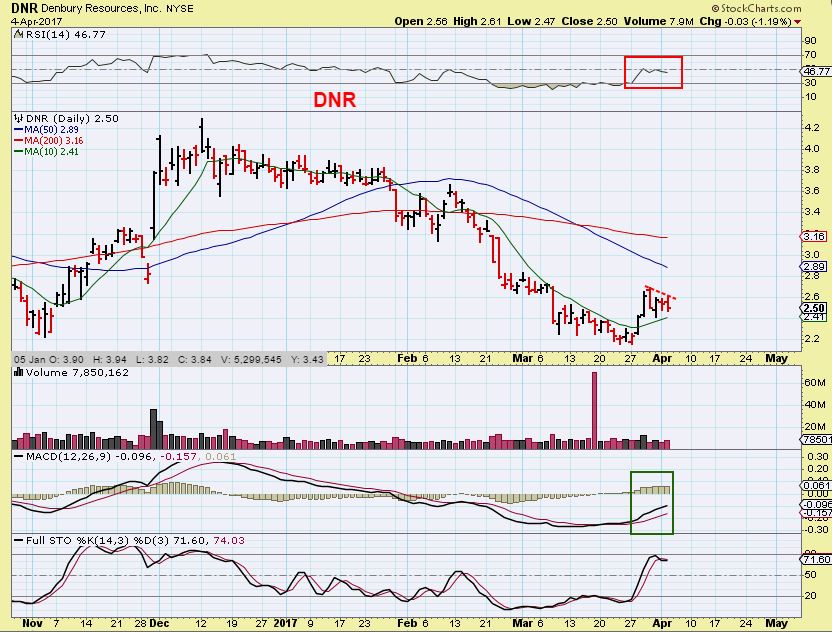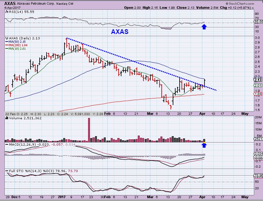 AXAS ( And AREX) are also acting well. AXAS had a bull flag but then it dragged on and became more of a pennant consolidation after a nice little run. Yesterday it Popped. It may be at resistance with that 50sma, but that consolidation could allow it to just pop right through the 50sma, like some other energy stocks have. I’ve seen several Energy stocks set up this way and then have the follow through needed to break out. I’m liking the energy sector again.