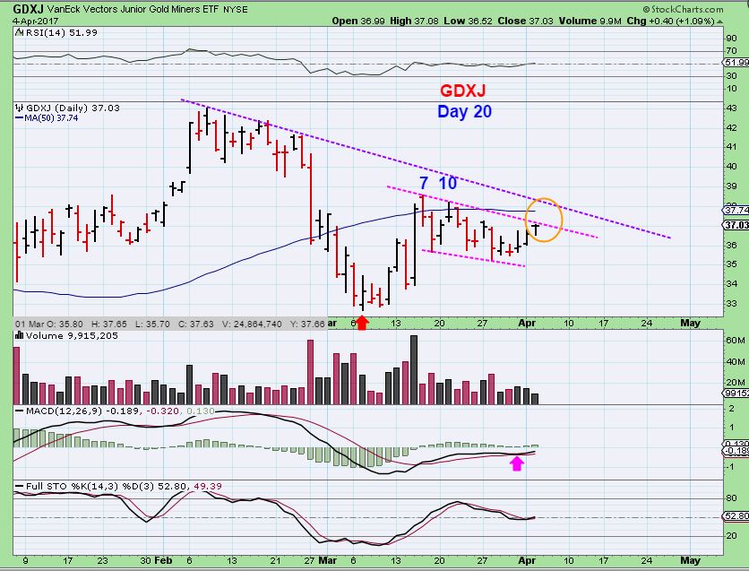 Nothing has changed, we are just waiting for things to play out to a finish, but the in between action is boring. I want to buy the dip when it arrives. I am still short at this time, but if you are in this trade and uncomfortable, just get out. JDST is around $14 and it was at $13 when GDXJ was at the 50sma, so exiting and waiting is an option.