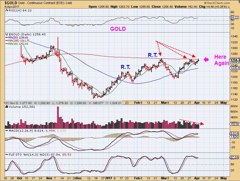 GDX – The MINERS put in a L.T. 2nd daily cycle and they should be weaker. You can see that GOLD is at its Feb highs, and Miners are only 1/2 way there. Miners are not leading and usually that is a sign of weakness. So far the Miners are pushing on the 50sma, but they have failed to move above it with conviction. Occasionally it does break above as shown, and rolled over later. We could see this type of fake out if Gold does break out. I have been short GDXJ at the 50sma, but shorting is tough during a topping process, especially in miners.