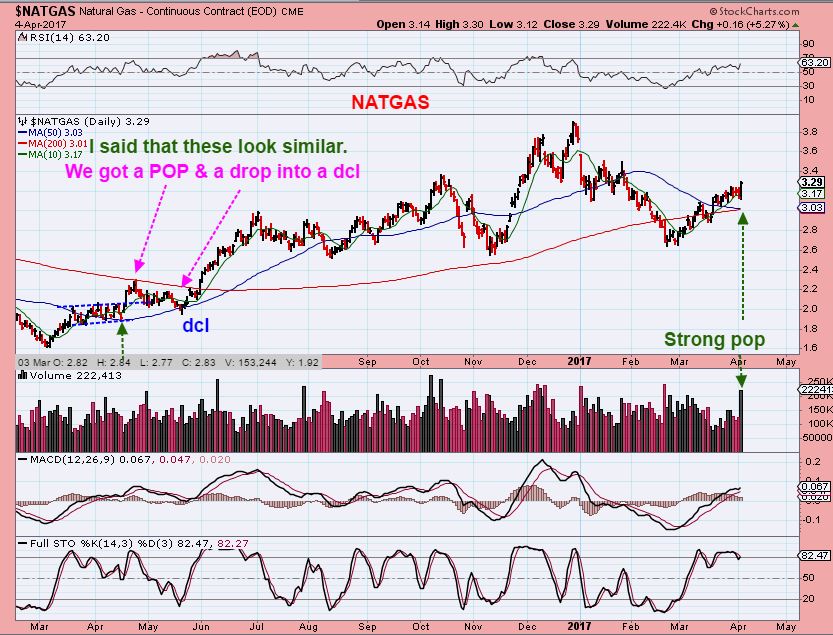 NATGAS – MARCH 31 I pointed out that these looked similar and we could be ready to drop to the green arrow. I wanted to buy NATGAS on the next dip ( And I still do).