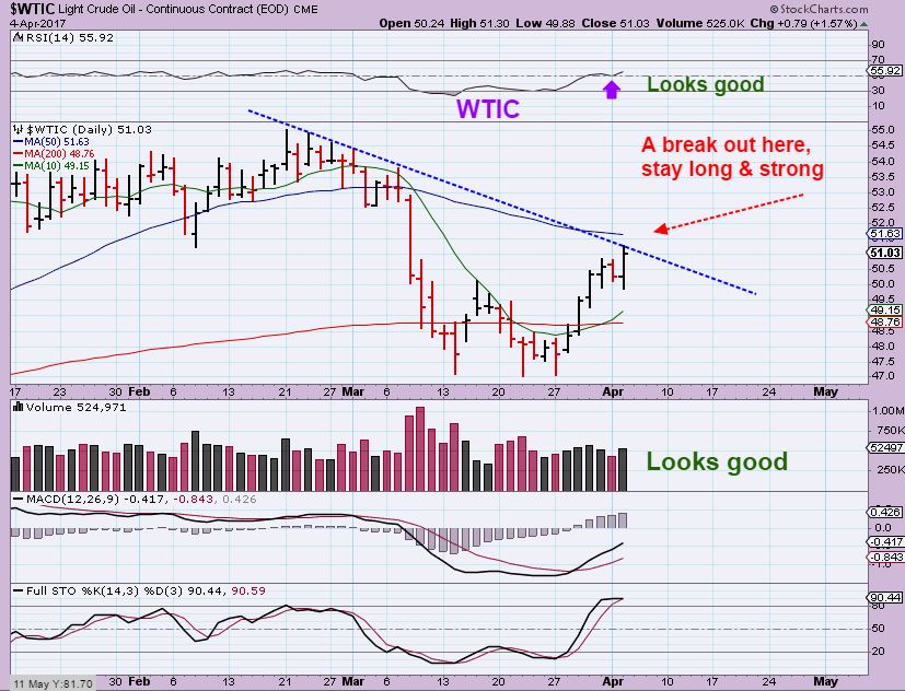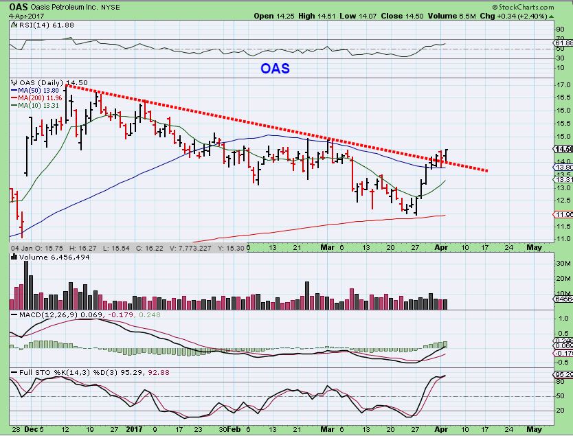 OAS also ran to the 50sma and just broke above the 50sma and above the down trend line. This is bullish follow through and I am seeing that type of action in several Energy stocks. THIS is why that double bottom undercut low in Oil may be noteworthy. These stocks are being bought up.