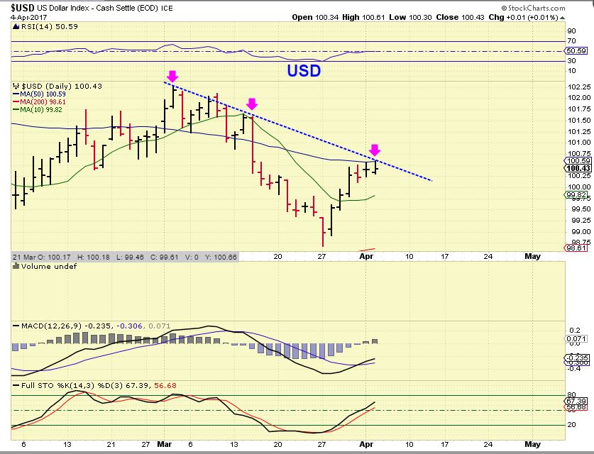 USD – the Dollar is at a resistance point with the 50ma and a downtrend line. A break out higher would likely send Gold down into its dcl, but this may pause to build up steam.