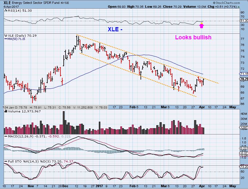 WTIC – Here you can see that Oil broke to a 2nd lower low after the chart above was drawn. OIL IS ALMOST AT THAT $52 AREA, and the RSI is above 50% (Bullish). The Energy stocks that I had pointed out as bullish set ups after that 2nd low are still doing well ( Bullish), and now other energy stocks are setting up nicely. OIL itself has made this run higher ( as expected) but we are at a point that is starting to really look bullish. If this breaks out strongly from here, just stay long & strong and we will take a closer look at the bigger picture. I’m going to discuss OIL and a few of our energy trades at the end of this report again. Let’s see the XLE…