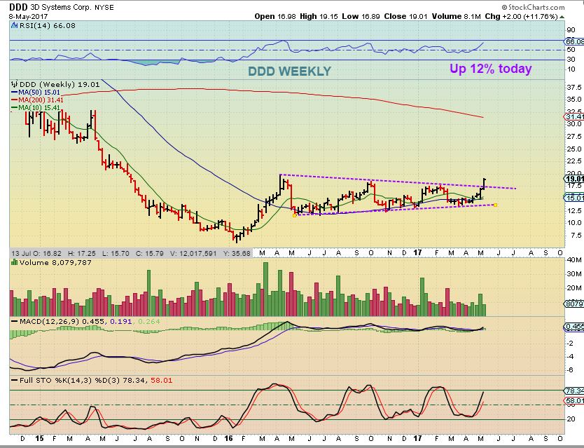 DDD – DDD broke out too, and Monday alone it was up about 12%. It was $15 recently and threatening to break out, but now it has and is at $19. This sector looks ready to run after a dismal year or two.