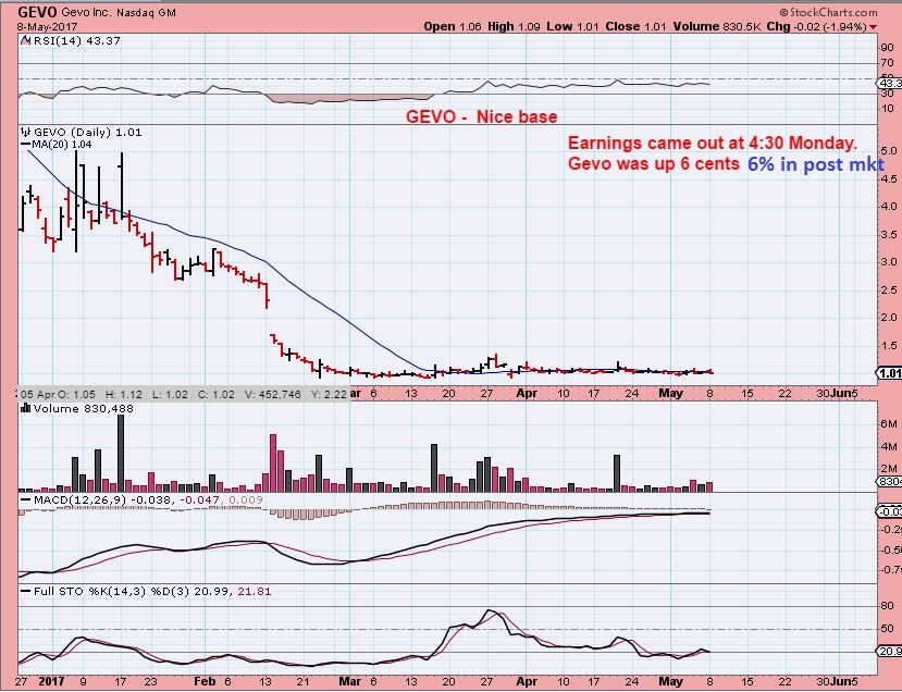 GEVO _ I bought this and own it , because I like this base and the volume pops within it. They had earnings after the bell on Monday and the stock ran up 6% by 6 p.m. It has since dropped, but that is way better than watching it drop in the post market. Let’s see what happens Tuesday.
