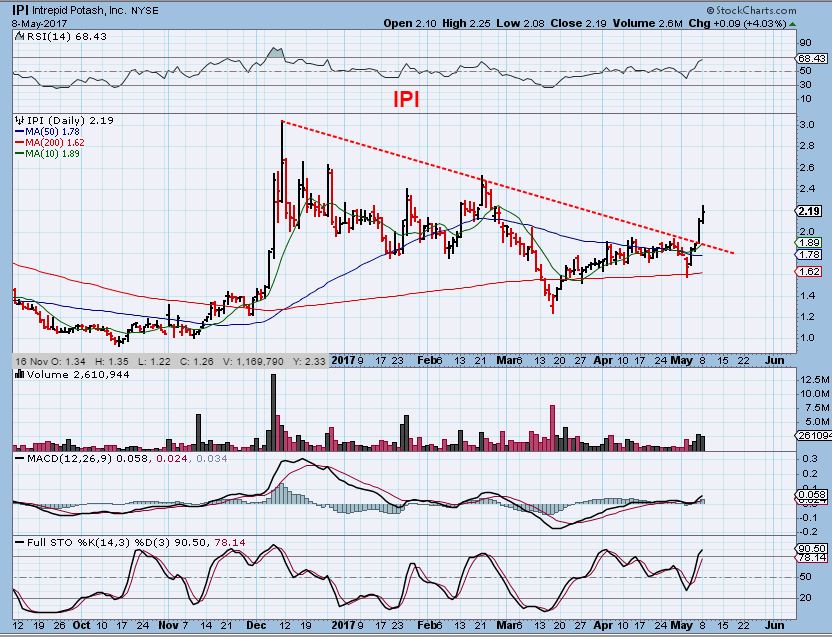 IPI – Last week one of our readers ( Thanks Chuck) reminded me that the IPI consolidation was worth watching. I didnt read my email until Sunday and Monday had further follow through. It goes on my watch list for a ‘buy the dip’ candidate, but these break outs can just keep running. .