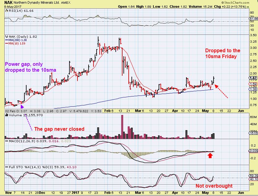 NAK #1 – Look at NAK in Nov 2016. It gapped open, dropped to the 10sma, and never looked back. That gap didn’t fill. I see that here again.
