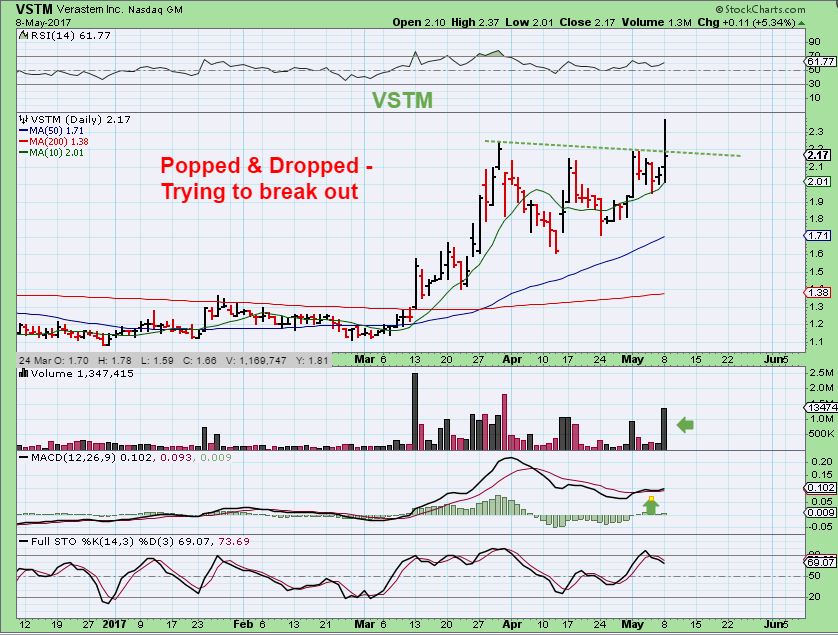 VSTM & CGIX have been mentioned here in the past – VSTM tried to break out and it does have the volume to do so. It has had a nice cup consolidation, and I like it as a fairly low risk buy here. This may follow through this week.