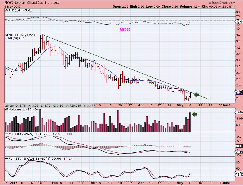 AREX & NOG look very good! Others seem to need time to prove themselves. Nog released earnings Monday a.m. & I wish I saw it on Monday. I want to buy NOG right now, it wants to break that downtrend. In Nov 2016 NOG ran up well over 100% from roughly $1.50 to $4.