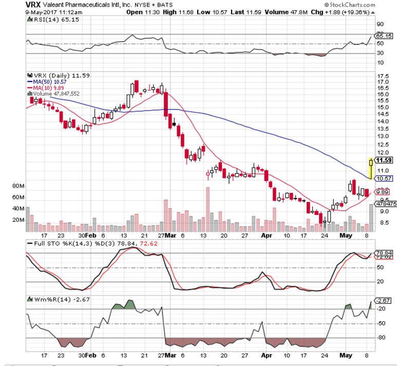 VRX – Gap up and run above the 50 day ma. Lots of room to run as the 200 day at $19.41.