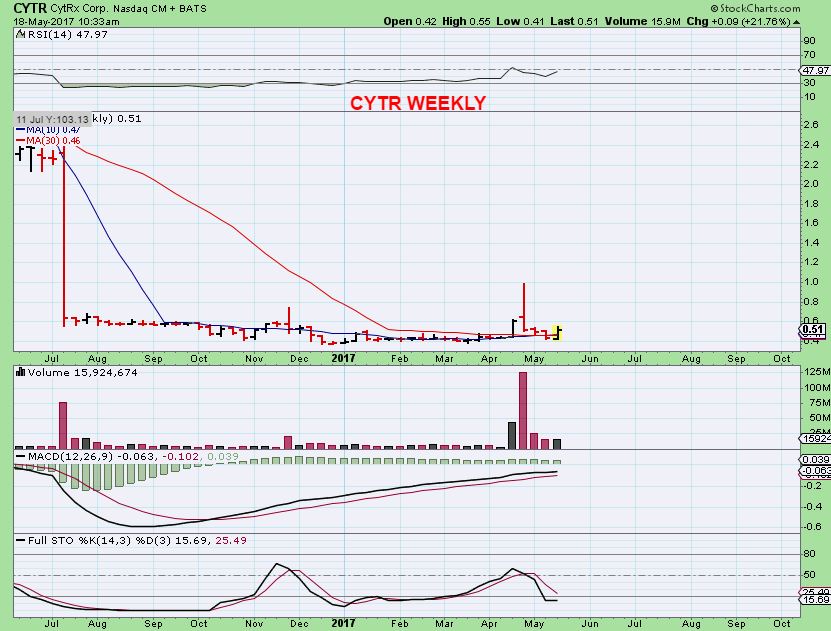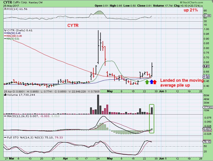 CYTR – Notice the 10, 50, & 200 sma are all piled up together and acted as support. That is usually bullish and this surge was 21% on Thursday. They are releasing news next week that could affect this stock Bullishly or it could sell off ( sell the news?), so be aware of that. If you bought this with me, you may want to sell a partial if your position is sizeable.
