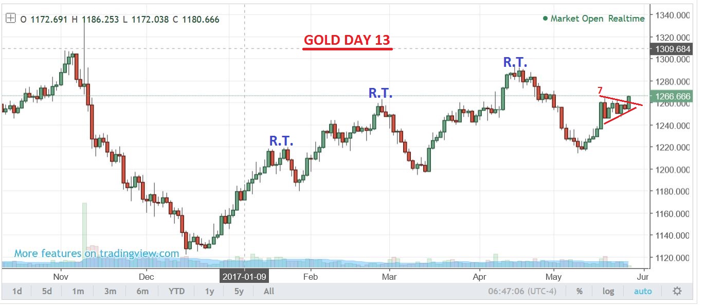 GOLD remained in an uptrend. It is breaking out on day 12. Again we see that GOLD is much stronger than Silver and the Miners. A normal price target here would be $1300, and that would make this 3 R.T. daily cycles in a row, plus another new high in Gold. This would be happening while SILVER & THE MINERS sold off and remain fairly weak? The Miners peaked in Feb and made lower lows and lower highs in March & May so far. We just have to see how GOLD plays out, and how the Miners react to it. This is NOT normal.