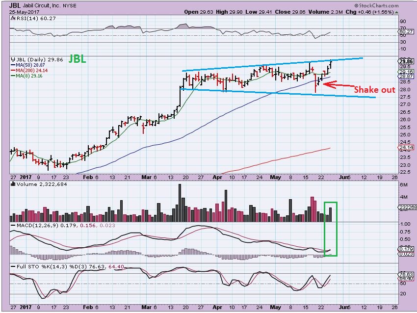JBL – Yesterday, I mentioned that with this long consolidation, it could be a break out after a ‘shake out’ at the 50sma. Is it time for JBL to run?