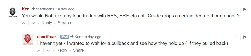 I am not always able to mention every trade that I take, and I may also not be recommending it to subscribers, because ‘shorting’ is more difficult for many ( Myself included). So I dont mention all of my trades, and I was also not in the comments section all day, I had some appointments to take, but … In my reports for weeks, I have been calling for that drop in Oil when it gets to that trendline. Then in a report this week, I pointed to a doji at the top of Oil run on the attached chart, and also at trend line resistance.