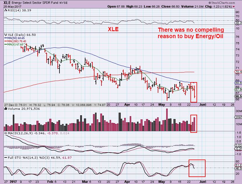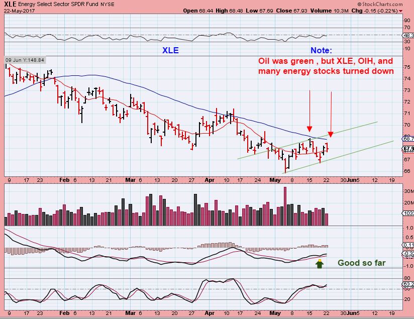 MAY 23rd– Oil was green, but look at OIL & Energy stocks. This was still warning that Oils rise may not be real. We’ll see how this plays out from here.