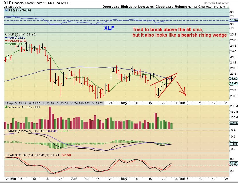 XLF – This still stands out as concerning to me so far. The XLF did break above the 50sma Thursday, but then it dropped back down, so now we see a doji at the 50sma. It now also looks like a bearish rising wedge. The XLF is just not in sync with the General Markets, unless it suddenly breaks out higher.