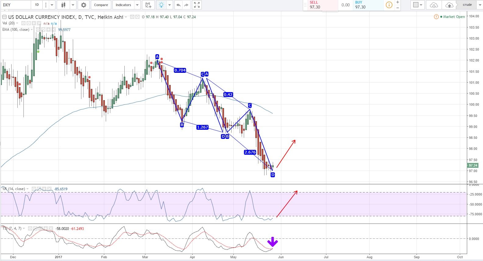 I’m not buying this move in gold. US Dollar looks primed to move higher here. The USD just finished a three drives pattern. TSI is crossing positive and %R is oversold and curling up. https://uploads.disquscdn.com/images/41770d7fd2f49c5657d0c457d3cb80ac5138fd7e0d0a038a357a6f0b2faac021.jpg