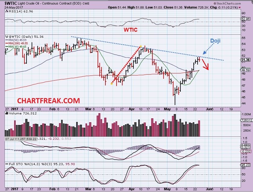 I am not always able to mention every trade that I take, and I may also not be recommending it to subscribers, because ‘shorting’ is more difficult for many ( Myself included). So I dont mention all of my trades, and I was also not in the comments section all day, I had some appointments to take, but … In my reports for weeks, I have been calling for that drop in Oil when it gets to that trendline. Then in a report this week, I pointed to a doji at the top of Oil run on the attached chart, and also at trend line resistance.