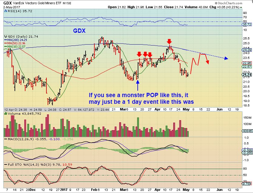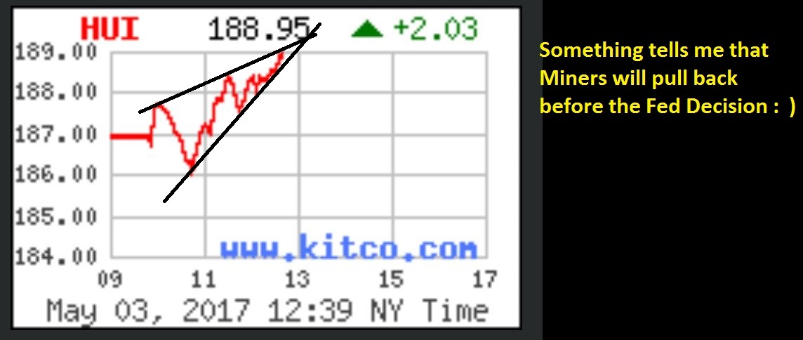 With 15 minutes until the Fed – I think this is up move in the miners will reverse sharply lower after the meeting. The Fed is likely to be more dovish given the recent weak data. Gold and the miners have rallied with hikes recently, not the other way around. If they remain hawkish, this move higher in miners sticks and is real. IMHO – Stocks rally, gold and miners dump post Fed minutes. We’ll see.