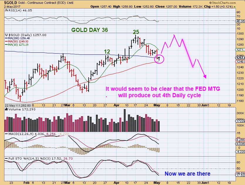 Day 37 for Gold & miners deep in the timing for a low. As mentioned in the report, A DCL could come on the FED day, but it is still a cautionary time, due to the way final daily cycles can act. Very choppy / sideways at times.