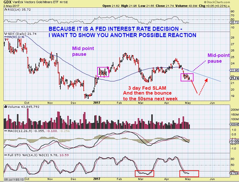 GDX – Read the chart. This is the idea that a FED DECISION is bearish for Gold & Miners. A quick slam down could take place.