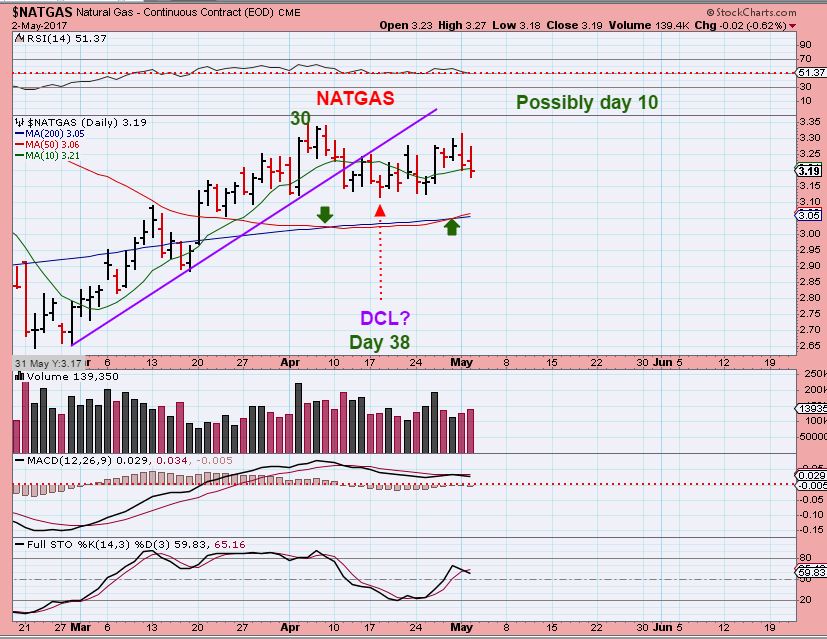 NATGAS – No real change, but I am looking at this as though the dcl could be in place. We broke the trendline and then recovered the 10sma. Thursday is the NATGAS inventory report.  I still haven’t taken my long Natgas position, but if that day 38 dcl holds, and we get a reversal higher, I might enter a long position.